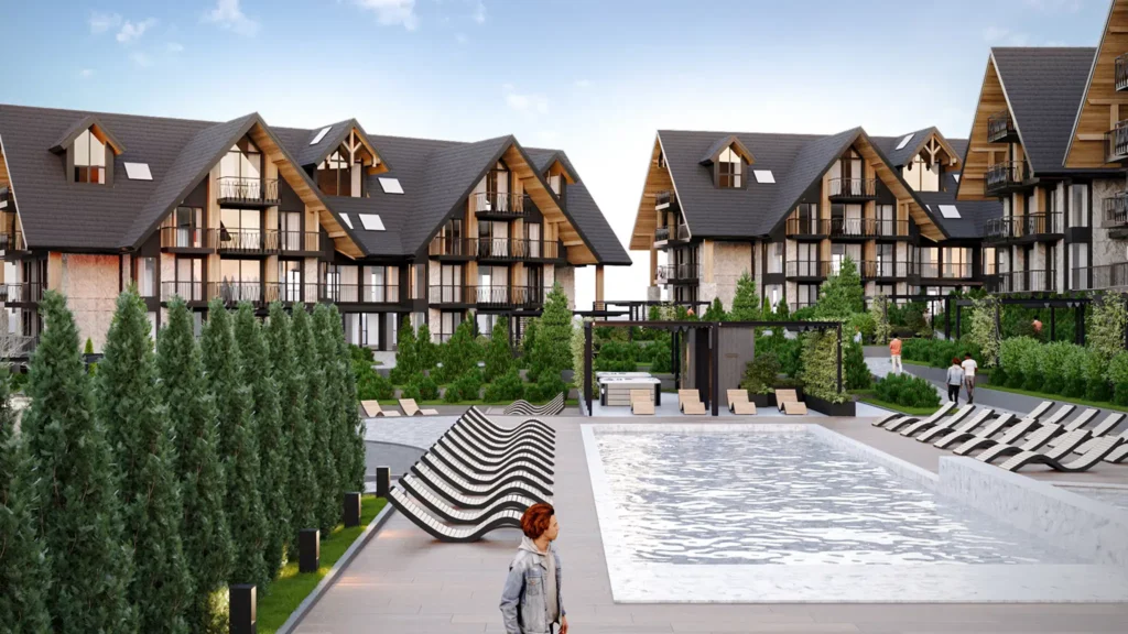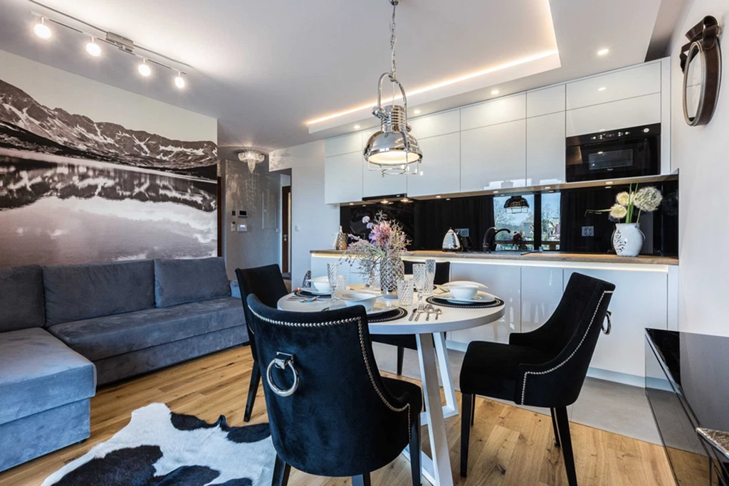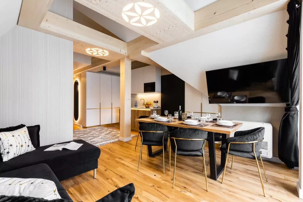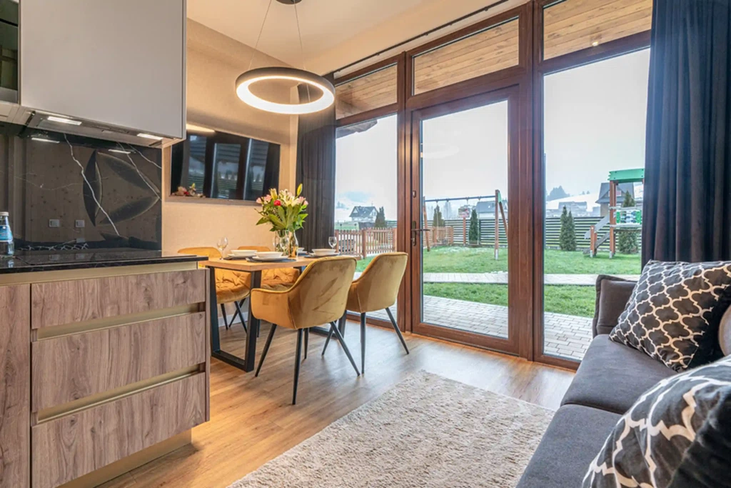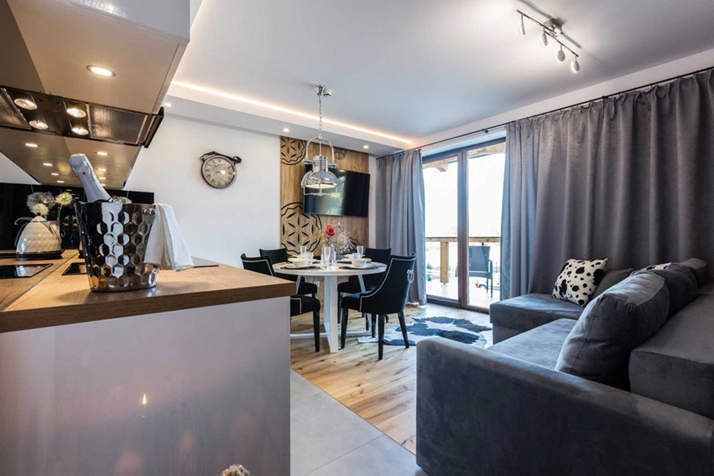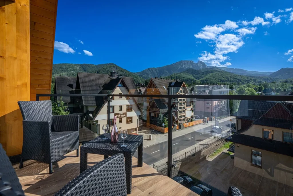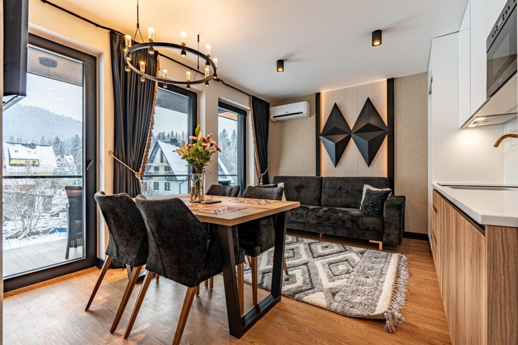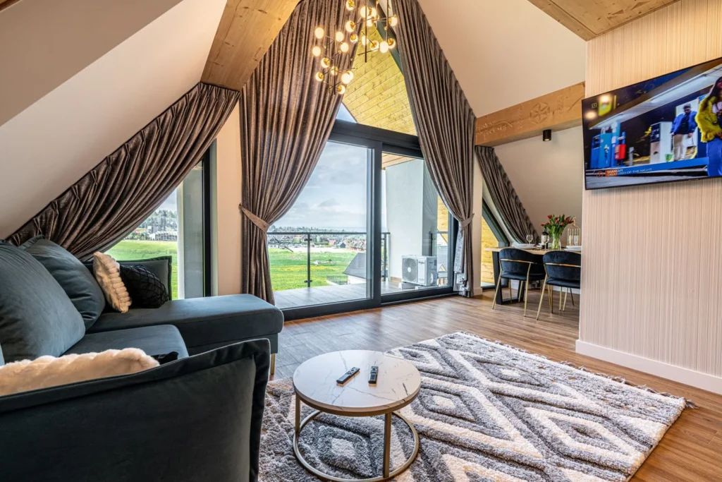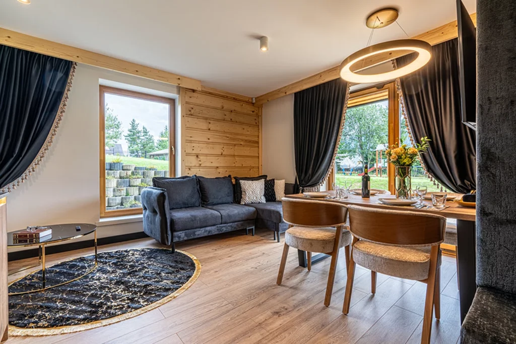 An elegant complex of comfortably equipped apartments with kitchenettes. Perfectly situated in historic Zakopane, it’s just steps from Krupówki, the city center, and the Szymoszkowa ski station. Amenities include a relaxation zone, a children’s playground, large parking, and a covered grilling area.